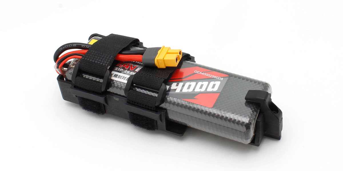 Battery holder is compatible with most commonly available R/C car battery types. Simple hook-and-loop fastener allows battery to be easily secured and detached.